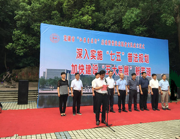 2017年6月27日上午,根據(jù)市法宣辦、市委宣傳部、市人大內(nèi)司工委《關(guān)于印發(fā)<蕪湖市2017年“江淮普法行”活動方案>的通知》統(tǒng)一部署,在赭山公園法治廣場舉行2017年“江淮普法行”啟動暨普法志愿者支隊成立儀式,市委、市人大、市政府、市政協(xié)領(lǐng)導(dǎo)現(xiàn)場檢查指導(dǎo),市中院、市檢察院、市司法局等多個單位參與。