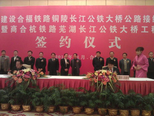 在簽約儀式上,省投資集團公司分別與蕪湖市政府、銅陵市政府簽訂了“合作建設合福鐵路銅陵長江公鐵大橋公路接線工程和商合杭鐵路蕪湖長江公鐵大橋工程”框架協(xié)議;省投資集團公司分別與蕪湖市交投公司和銅陵市交投公司簽署“合作建設合福鐵路銅陵長江公鐵大橋公路接線工程合同書”。兩項投資協(xié)議的簽署標志著商合杭鐵路蕪湖長江公鐵大橋、合福鐵路銅陵長江公鐵大橋公路接線工程兩個項目公司正式成立運作,對我市實施擁江發(fā)展具有重大的戰(zhàn)略意義。